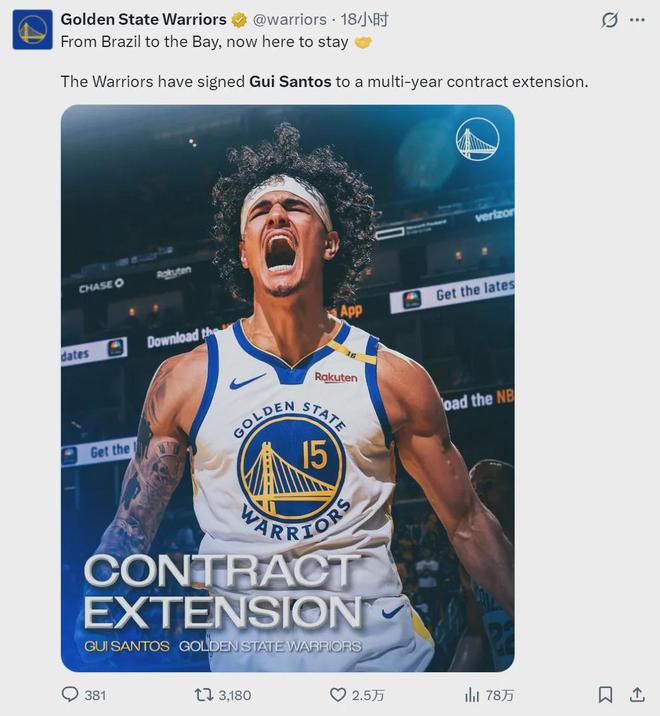 3年1500萬美元!勇士官宣提前續(xù)約桑托斯:第3年是球員選項